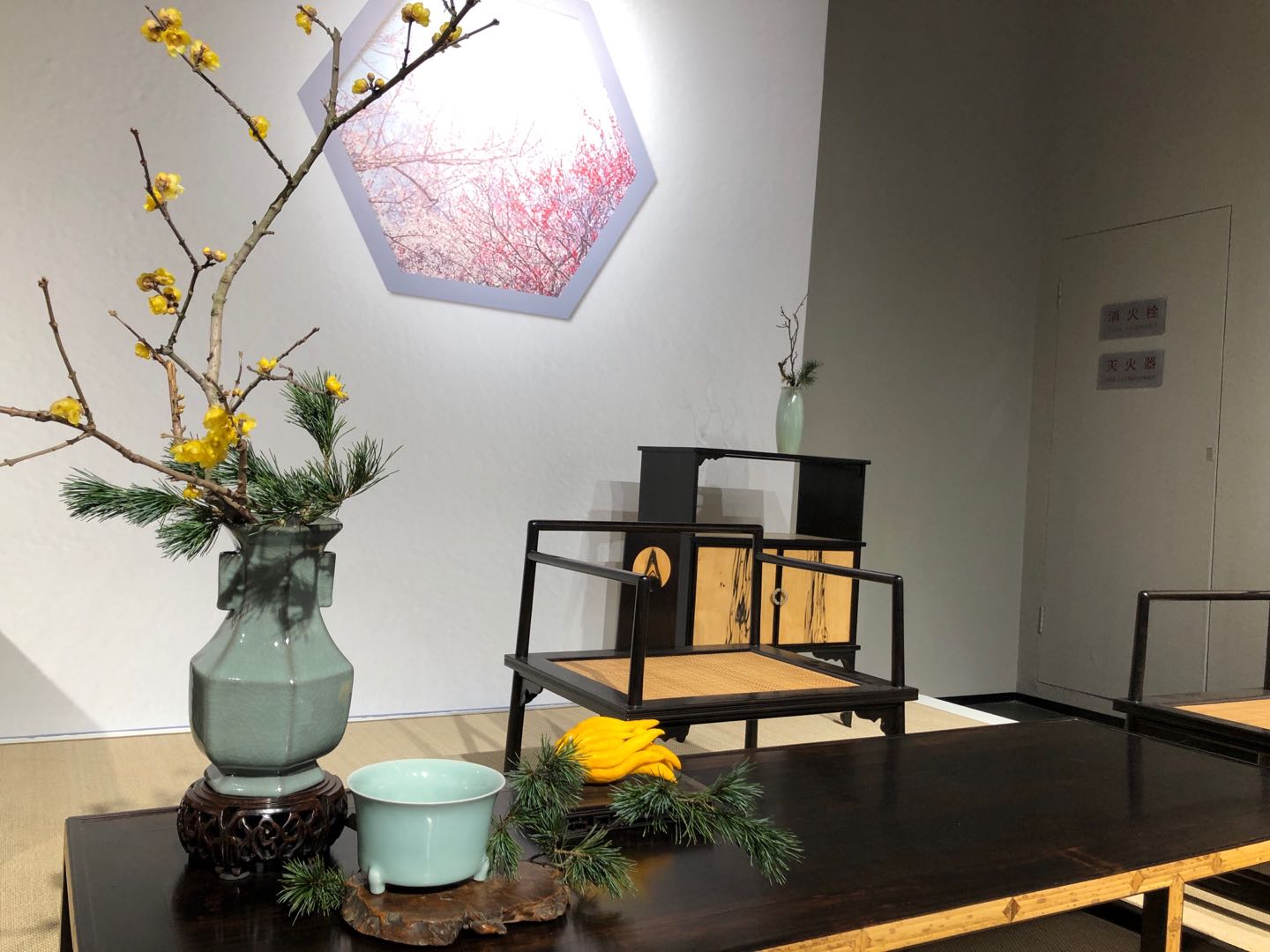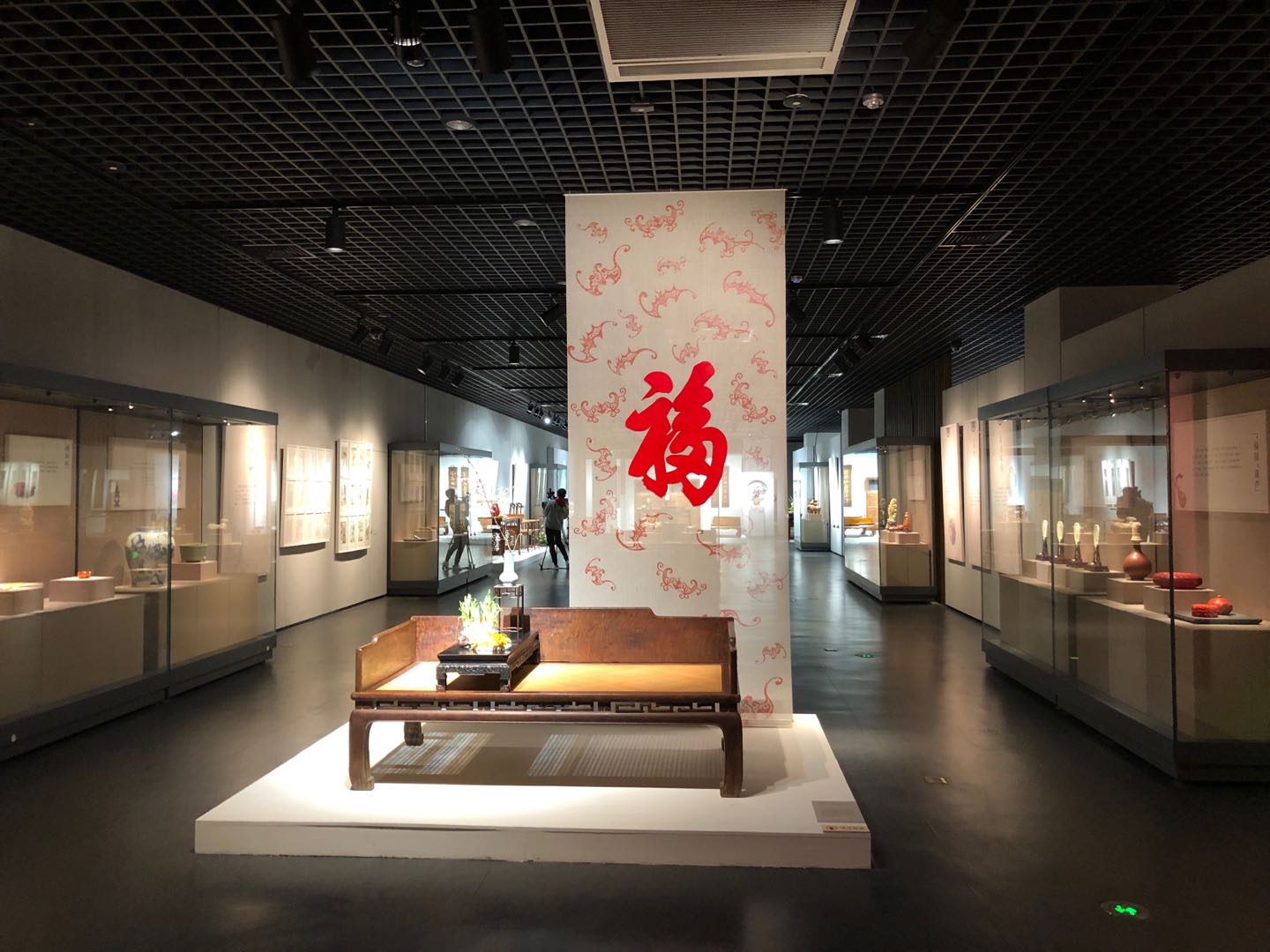进入展厅,迎面是从屋顶垂下的大大“福”字,字前的罗汉床上摆着炕桌,桌上有水仙、佛手和一支梅花,营造出传统生活空间的一角。