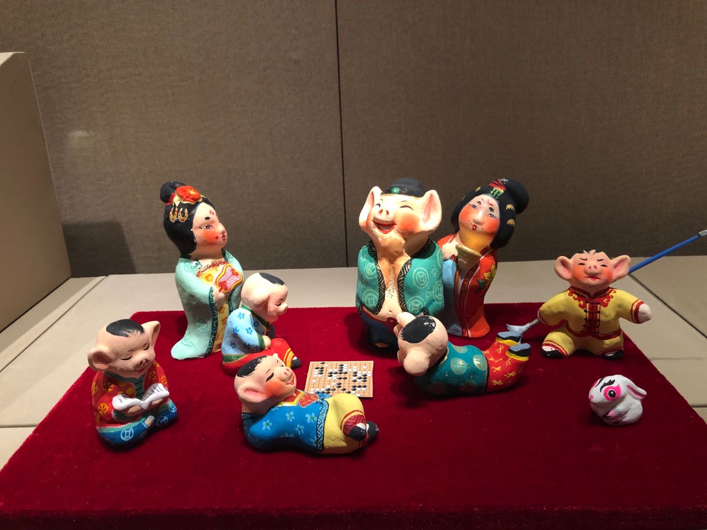 展览中还有一些非遗作品,虽然不是特别珍贵但却妙趣横生。泥塑《情满高老庄》想象猪八戒在高老庄娶了媳妇,还生了一屋的小猪,猪八戒偎红倚翠,而他的孩子们有的在下围棋,有的在习武,有的在看书,还有的在睡觉……一家人看起来幸福又欢乐。