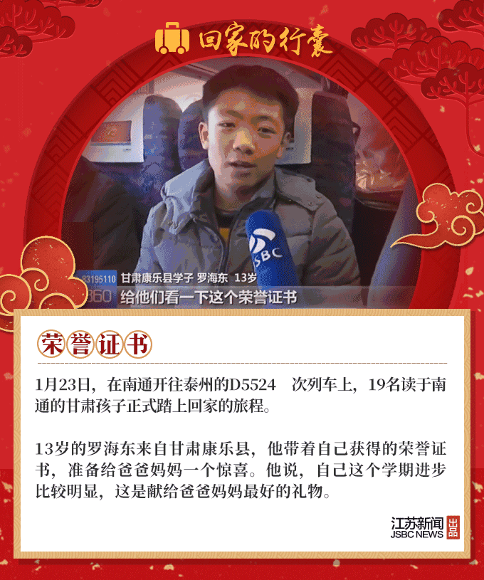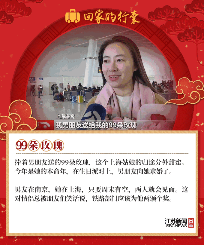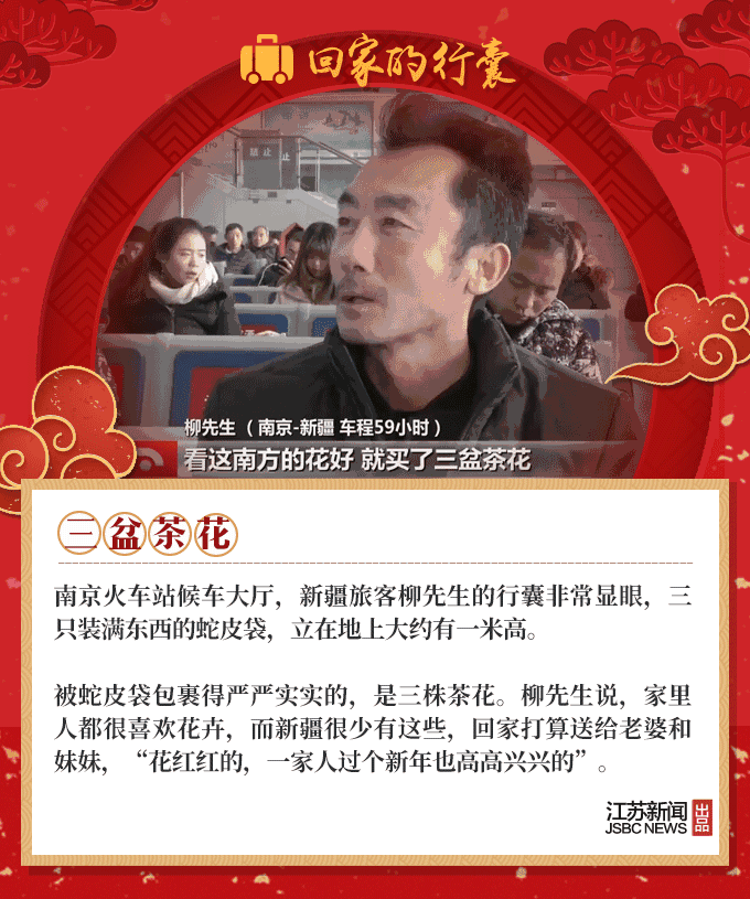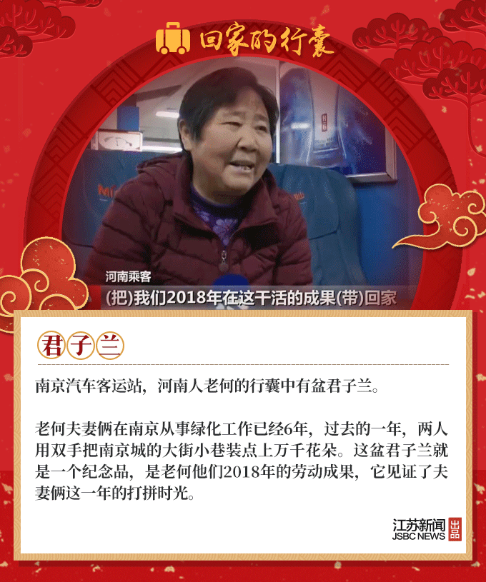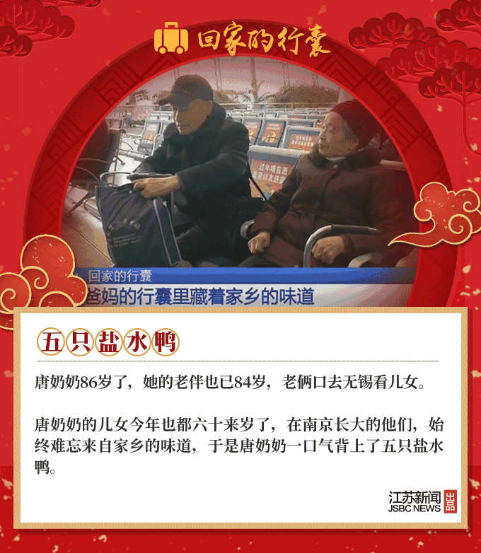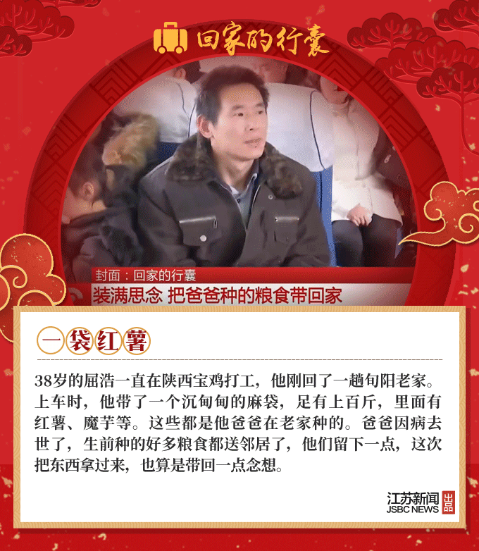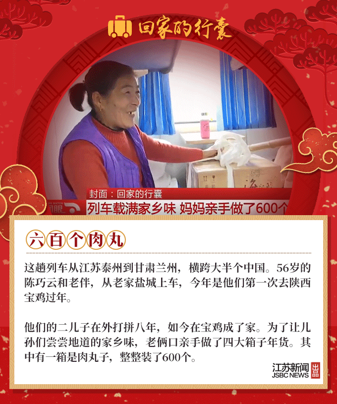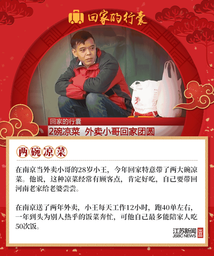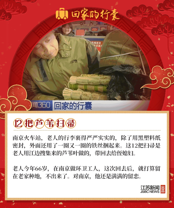 2019春节到,又是一年回家时,人们回家的行囊里,装满了对家人温暖的思念。66岁的环卫工大叔,自制了12把芦苇叶扫帚;盐城的老夫妻亲手做了600个肉丸,去宝鸡看儿子;河南的外卖小哥打包了两碗热销的凉菜,给媳妇尝尝……春节团圆,家国天下,我们的生活是如此欢喜美好。