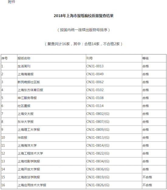 2018年下半年我局委托上海市期刊协会,对2017年本市报纸编校质量检查不合格报纸开展了复查,现将复查情况通报如下: