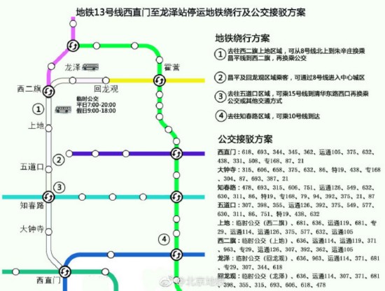 为配合京张高铁建设施工,地铁13号线西段(西直门站、大钟寺站、知春路站、五道口站、上地站、西二旗站、龙泽站)于2019年2月10日至16日暂停运营,换乘站停止换乘。上述车站停运期间,大家可登陆北京地铁官方网站(www.bjsubway.com)进行路线查询。地铁绕行及公交接驳方案详见下图: