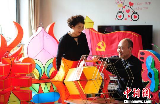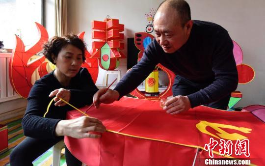 中新网太原2月1日电 (任丽娜)随着中国民间最隆重、最热闹的传统节日——春节的日益临近,山西省临汾市安泽县府城村村民孙宝珉、李慧萍夫妇此间正在忙碌地制作着花灯,为了庆祝安泽县2018年全县脱贫摘帽,夫妇俩特意手工制作了党旗花灯迎接2019年新春佳节。