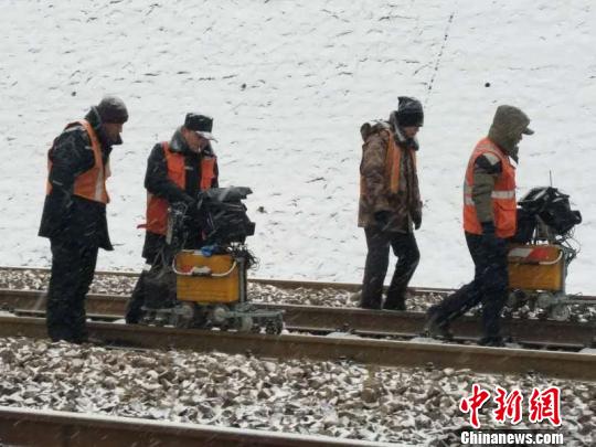铁路职工顶风冒雪进行钢轨探伤。任丽娜 摄