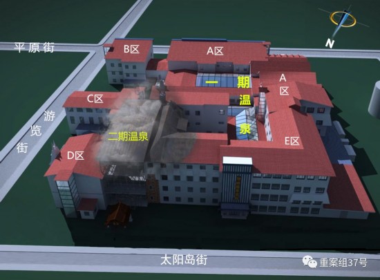 起火建筑位于哈尔滨市松北区太阳岛风景区内,主体建筑分A、B、C、D、E区及一、二期温泉区。A、B、C、D、E区为砖混结构,加高接层改扩建部分为彩钢板结构,一、二期温泉区为钢结构彩钢板顶棚。