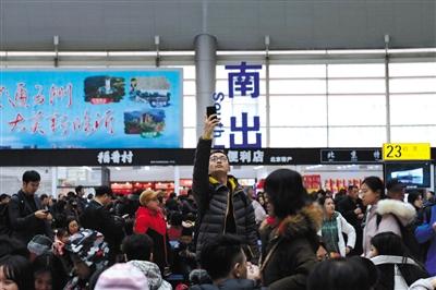 2019年2月1日,北京南站,一位男士在候车厅拍照。