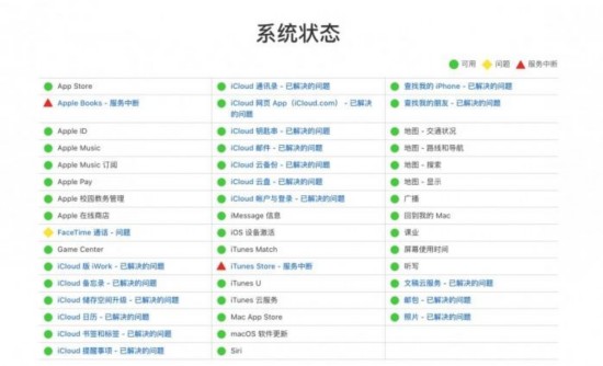 在中国地区苹果系统状态页面,App Store 的状态并没有显示故障。不过,在美国地区的苹果系统状态页面,已经显示 App Store 遇到了问题,用户无法访问。