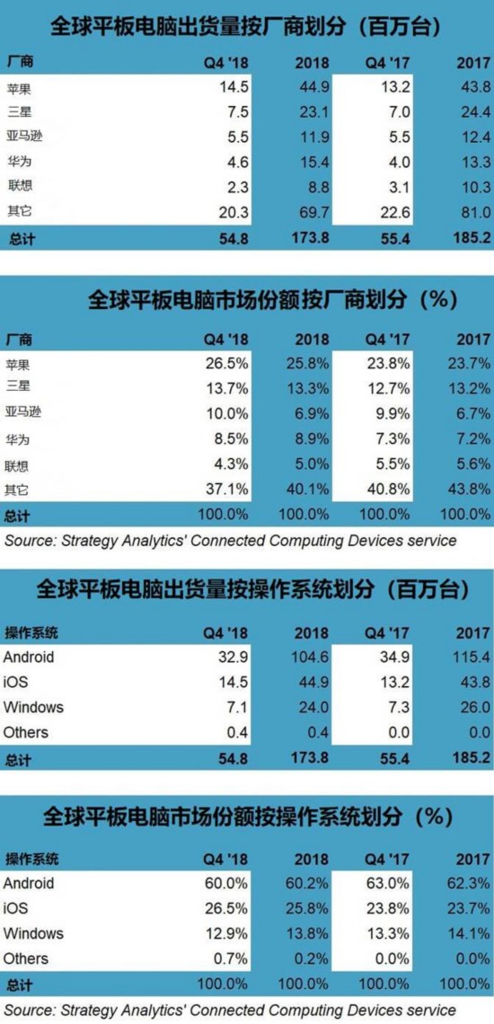 根据Strategy Analytics最新发布的研究报告显示,2018年,三星自2014年以来首次全球季度出货量实现增长。 由于平板电脑市场出现复苏迹象,苹果、华为和微软也在第四季度表现优异,全年三家厂商均实现增长。全球平板电脑市场出货量在2018年Q4下降1%,2018年全年同比下降6%至1.738亿台。