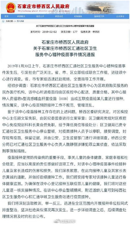 2月2日,石家庄市桥西区人民政府通报称,经初步调查:石家庄市桥西区汇通社区卫生服务中心为区政府购买服务的民办医疗机构,该中心所进疫苗均由区疾控中心配送,质量合格。其中心接种人员错将b型流感嗜血杆菌疫苗(HIB)当成五联疫苗给某儿童进行接种,情况属实。该中心疫苗预防接种工作不规范,管理混乱。