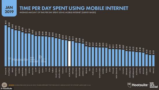 日本人在网上花费的时间最少,平均为3小时45分钟,其次是中国。每日在计算机上使用互联网的时间方面,南非、哥伦比亚、巴西紧随菲律宾之后。