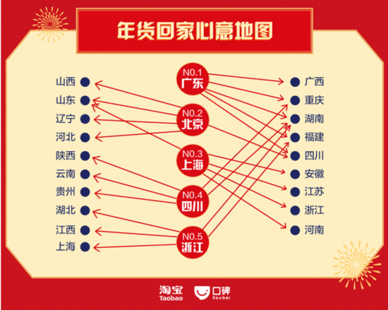 春节是一年一度游子回乡的时节,在淘宝上采购年货回家,也折现了异地游子的思乡情。据淘宝数据显示,广东、北京、上海、四川、浙江成为全国游子最多的五个省市,游子们纷纷在这里下单,寄送年货回家。其中,在北京打拼的游子大多寄回山西、山东、河北等地;而驻扎在广东的游子则爱往湖南、福建、四川寄送年货。