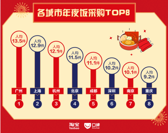 哪里人最爱为年夜饭操心?以吃为乐的广州人表示:我们绝不能服输。淘宝数据显示,这个腊月里,广州人平均下单15.3件年货,雄踞全国第一。而上海人、杭州人也以12.9件、12.1件紧随其后,而成都人则成功跻身前五之列。