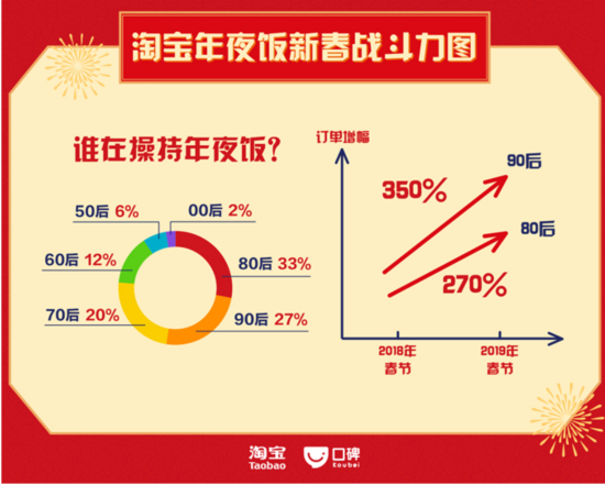 以往,年夜饭总是家中长辈操持,而如今,正在有越来越多年轻人加入了年夜饭的操持大军。据淘宝数据,从腊八开始,在淘宝上下单购买食品、酒水、零食、海鲜、肉类等年货的消费者中有超过一半为80后、90后,其中90后增幅位列第一,相比去年春节期间,订单增幅达到350%。