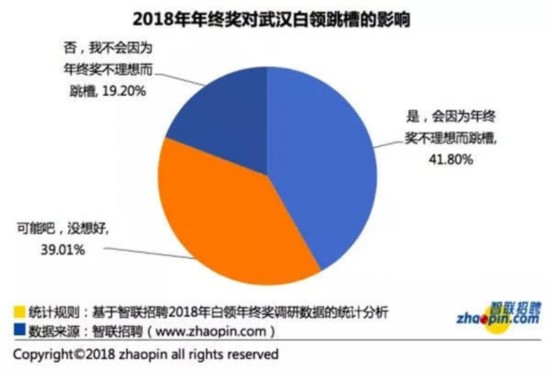 智联招聘“2018武汉白领年终奖调查”显示,参与调查的武汉白领中,有43.34%表示能够拿到年终奖,武汉白领中有41.80%表示年终奖会是影响跳槽决定的重要因素。