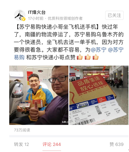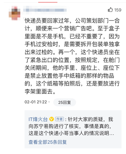 事情经过媒体报道后,苏宁物流春节不打烊的服务得到了网友的点赞。不过也有网友质疑这是一种商家营销事件。首先飞机送货成本太高,有明显的作秀嫌疑;其次送手机的包裹不但没有拆开安检,快递小哥在飞机上拿着快递盒拍照的行为也有些不妥。