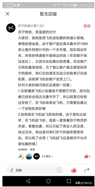苏宁快递小哥还向网友解释了装有手机的包裹未拆封的原因,包裹在到达乌鲁木齐前已经过了安检。网友看到的照片也是在飞机起飞前拍摄的,并略带调皮的提醒大家“飞机起飞后是绝对不允许拿包裹的哦”。