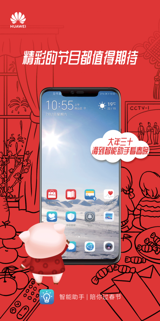 作为除夕当晚的国民“必选动作”,春晚一直致力于利用最新的技术和手段让“看春晚”变得更方便。为此,作为官方播出平台的央视影音客户端引入华为智能助手助力融合传播。2月4日除夕当天,华为手机滑到最左侧屏智能助手,即可收看春晚节目单。在春晚节目同步播出的时候,可以在华为智能助手的春晚节目单页面第一时间收看上一个节目的视频回看,也可以一键下载或唤起央视影音客户端观看直播。华为智能助手与央视影音跨界连线,致力于为全球华为手机用户带来一场前所未有的观看体验。