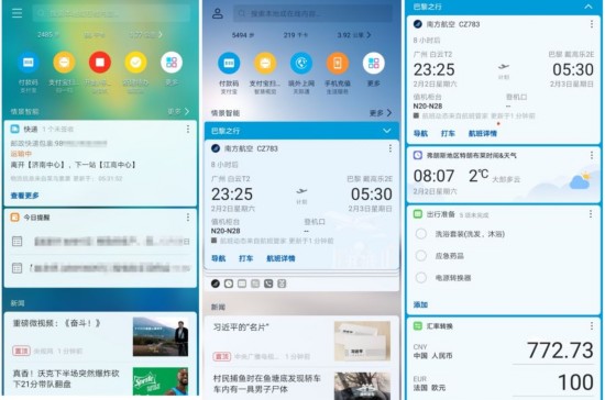 情景智能通过多达27种卡片为用户提供智能提醒和便捷服务,覆盖了工作差旅、居家生活、旅游出行的方方面。例如,普通用户要查看自己在多家网购平台购买商品的快递,需要到对应APP逐一查看,但华为用户通过情景智能快递卡片清晰地看到自己所有快递的状态。另外,如购买火车票和机票后的出行卡片,也非常方便和体贴。