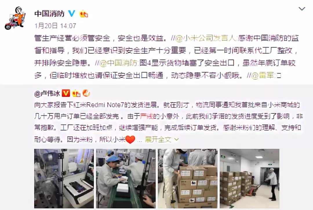 今年1月20日凌晨,小米集团副总裁红米Redmi品牌总经理@卢伟冰发布了一条微博称,由于产线的小意外,发货进度受到影响,工厂还在加班加点,完成后续订单发货。还给这条微博配了4张图。