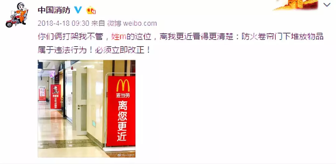 类似的事情去年也有发生,去年4月18日,@中国消防发布了一张肯德基与麦当劳同框的照片并配文称,你们俩打架我不管,姓M的这位,离我更近看得更清楚:防火卷帘门下堆放物品属于违法行为!必须立即改正!