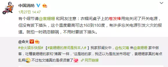 1月27日,@中国消防隔空喊话@袁姗姗称,有个细节请@袁姗姗和网友注意:衣帽间桌子上的卷发棒用完关闭了开关电源,但没有拔下插头,这个温度最高可达160到180度,有许多忘关电源引发火灾的报道。随后,@袁姗姗发文回应@中国消防,感谢提醒并送上小桃心,消防知识要牢记!一定改正追求幸福生活!