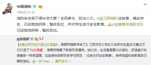 后来,@中国消防转发并提醒说,学生宿舍属于人员密集场所,根据我国公共安全行业标准《人员密集场所消防安全管理 ( GA 654-2006 ) 》,不得随意乱接电线,擅自增加用电设备。