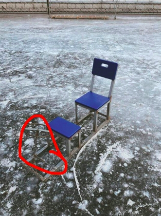 记者取得一辆冰车后发现,冰车为铁板焊接而成,在一长方形铁框上分别焊接一张铁椅、一个铁凳和一个由铁质三角架和铁棍支撑起来的圆盘状扶手。坐椅上镶有蓝色塑料坐垫与靠背,圆盘状扶手并不能控制方向,车辆的移动和制动全靠手持的冰叉控制。