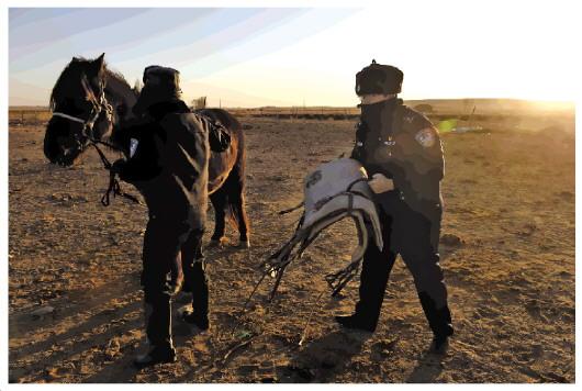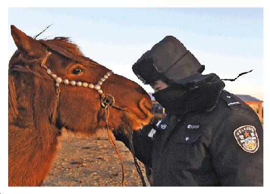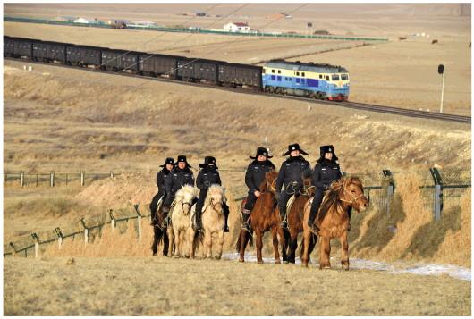 1月27日下午5时30分,太阳渐渐西沉,锡林郭勒大草原上的气温降至零下23℃。在桑蓝铁路线43公里处,伴随着呼啸而过的列车,一支马队沿着铁路护网缓缓走上草坡——他们是锡林浩特铁路公安处正蓝旗车站派出所负责巡查线路安全的草原铁路骑警队。