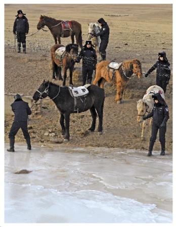 1月27日下午3时,巡逻途中经过一处结冰的河沟,骑警队员们牵着马小心翼翼地通过。