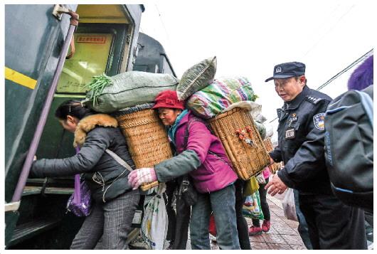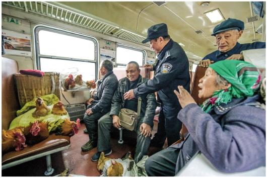 眼看春节就要到了,沿途各站旅客越来越多,他们中有的是扛着大包小包回家的打工者,有的是背着山货去城里卖、再买回年货的村民。陈超反复叮嘱车厢里的每位旅客注意安全,看管好随身财物。
