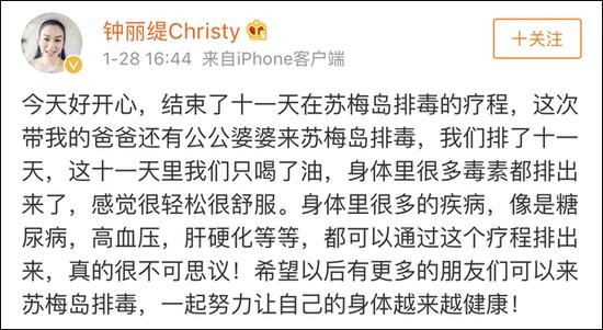 1月28日,钟丽缇在微博晒出泰国苏梅岛美景,表示带爸爸、公婆到苏梅岛进行11天排毒疗程,期间只喝油,身体里很多毒素都排出来了。2月2日,@丁香医生转发钟丽缇微博并配文:排毒产品最后真正能排掉的,大概只有钱包里的钱了