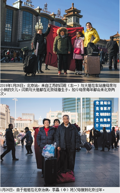 列车准点到达,孙丽的泪水已在眼眶打转,反而是婆婆,脸上洋溢着笑容:“来北京过年挺好,见见世面。”她说:“在哪儿过年不重要,团聚才最重要。”
