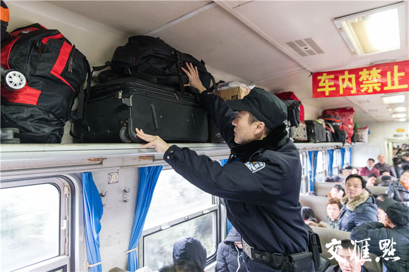 1月30日下午13点02分,列车载着1800余名务工人员从上海火车站缓缓出发了,此时列车基本上处于满员状态。孟路知道,到了南京境内还要挤,基本上可以趁现在人少一些,一边检查行李物品,一边发安全宣传。车开出10分钟左右,他就深入硬座车厢,在人群的缝隙中艰难穿行。