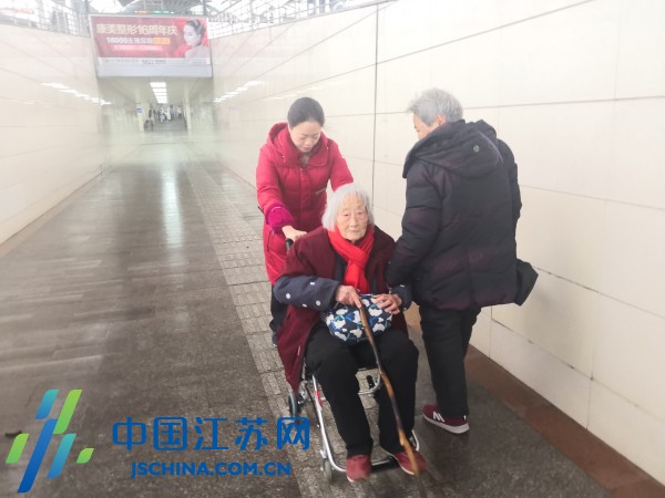 快过年了,为了满足刘奶奶全家团聚的愿望,在大女儿、二女婿的陪伴下,刘奶奶乘坐ZE16004次动车从南京到南通儿子家过年。刘奶奶已是百岁老人,行动不便,加上陪同的大女儿、二女婿都已是年逾古稀,这15分钟的出站路程,对一家人来说也是个不小的挑战,于是他们只得寻求火车站工作人员的帮助。“姑娘谢谢你,这一路辛苦了。”到了出站口,刘奶奶拉着马云的手不放,马云的耐心周到、细致温柔得到了一家人的夸赞。