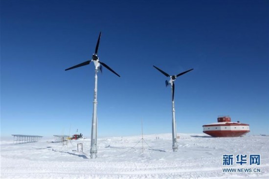 泰山站的太阳能板和风力发电机为主体建筑(右)提供清洁能源(2月2日摄)。 新华社记者 刘诗平 摄