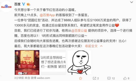 根据百度官微透露的信息,该用户参与的是百度App目前正在进行的“团圆红包”活动,他在短时间内达成了组队8888人解锁1000万奖金瓜分资格的任务,并获得了超过13000元的活动奖金。1月31日晚23点左右,百度App的客服人员在用户反馈留言平台中看到了该用户的留言,留言内容为:“拿到的一万多百度活动的奖金想捐给壹基金(用户写为‘一’),初衷想分给一起拉人的朋友,但是想了想还是做点有意义的事情,希望百度一起(用户写为‘意思’)进来,和我们一起捐赠,望回复。”