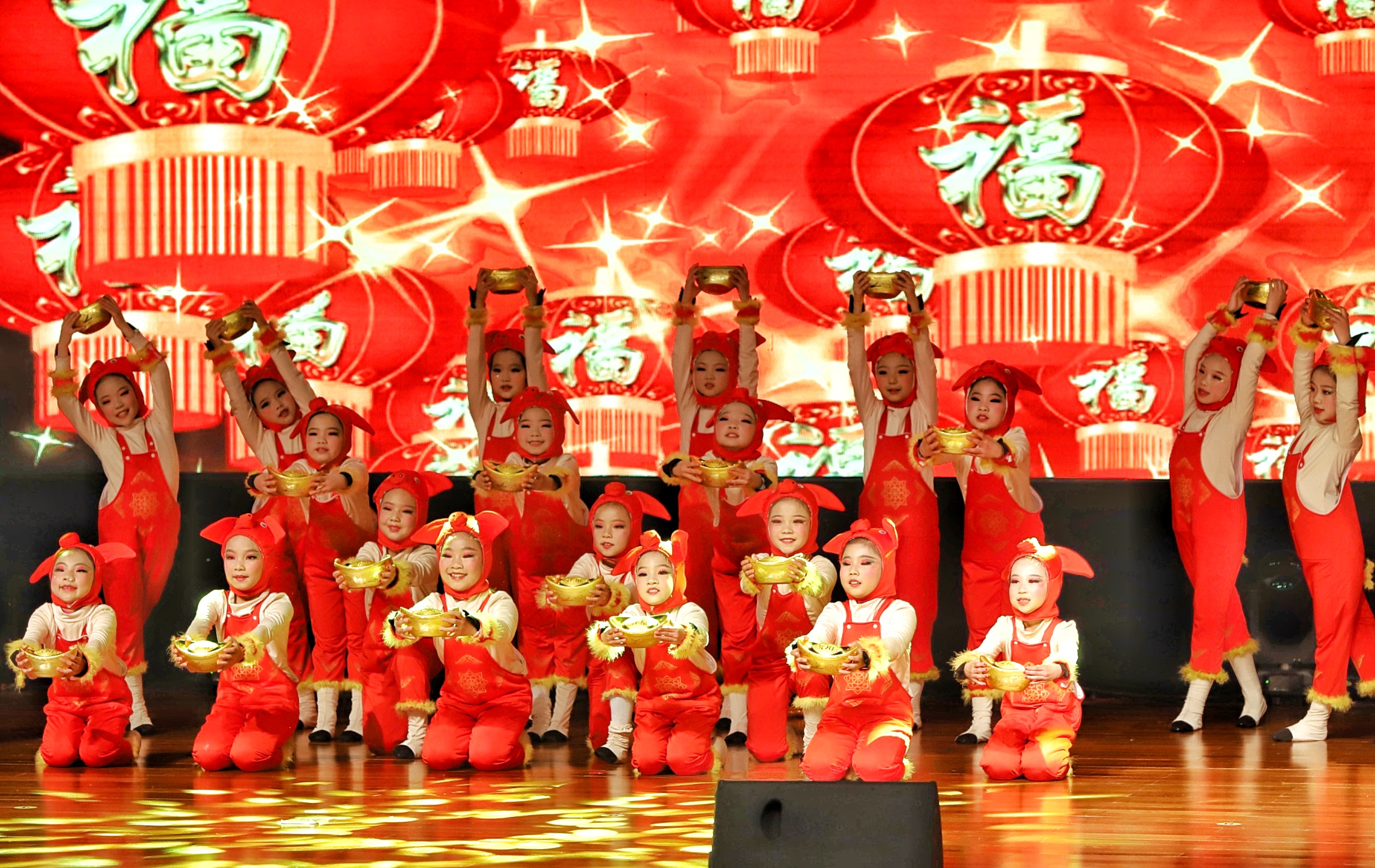 萌娃闹春,2019年1月28日,连云港市赣榆区海头镇举行迎新春文艺演出,一群天真可爱的孩子在舞台上大秀演技,萌态十足。王涛 许元丽 摄 视觉江苏网供图