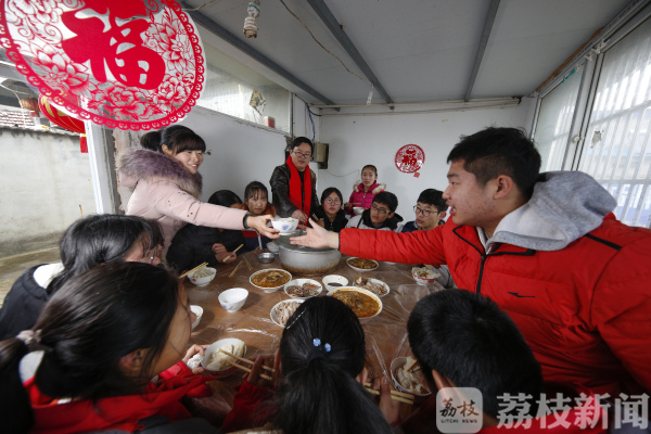 临近中午,吴凯招呼着孩子们回家。跨进家门,大家动起手来,有的包饺子,有的挂灯笼、贴春联。仇集中学学生陈继媛告诉记者,到吴老师家就和自己家一样,就很自然,“跨进这个家门,我感觉很温馨。”