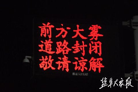 △高速电子显示屏上打出“前方大雾、道路封闭、敬请谅解”的警示语。
