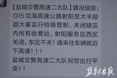 4日0点50分左右,受浓雾影响,高速公路上的能见度已经低于200米,部分团雾严重的路段已经不足50米,为了保障车辆的通行安全,盐城境内的沈海、盐靖、盐徐等高速先后实行了特级交通管制,禁止除执行公务的特种车辆以外的社会车辆上高速行驶。凌晨1点钟,上高速的匝道已经关闭,电子显示屏上打出“前方大雾、道路封闭、敬请谅解”的警示语。