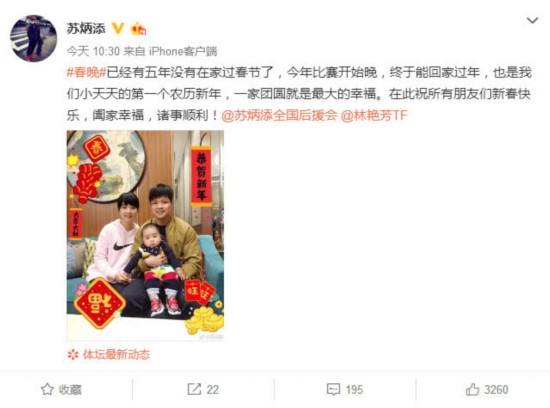 这些年由于基本都在外训练和比赛,苏炳添已经很久没回家过春节了,他写道:“已经有五年没有在家过春节了,今年比赛开始晚,终于能回家过年,也是我们小天天的第一个农历新年,一家团圆就是最大的幸福。在此祝所有朋友们新春快乐,阖家幸福,诸事顺利!”