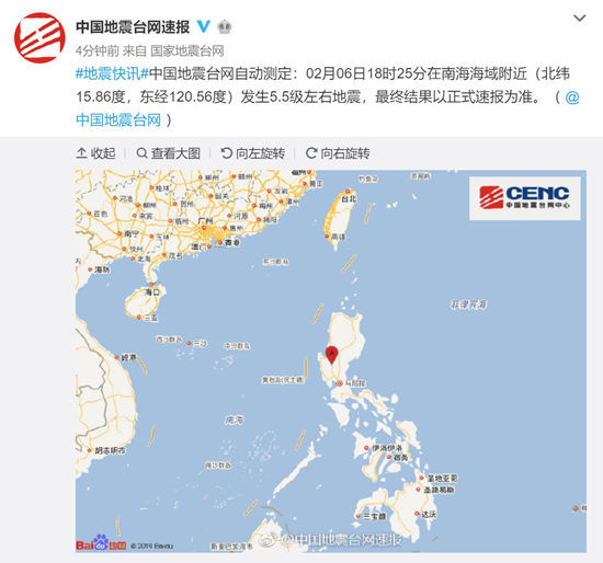 中国地震台网自动测定:2月06日18时25分在南海海域附近发生5.5级左右地震,最终结果以正式速报为准。
