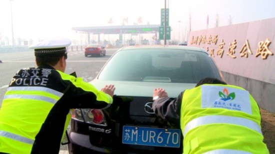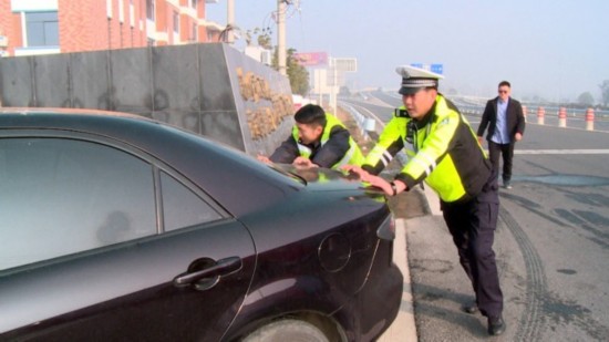 上午9点30分,记者在泰镇高速泰州东收费站口见到了正在执勤的交警郭建华。因为早上下大雾,高速公路特级管制,限制车辆通行,收费站口堵了有近200米。等到高速公路解封,意外状况发生了,郭建华在巡逻时发现一辆汽车停在行车道上不走。上前一询问,原来车子打不着火抛锚了。