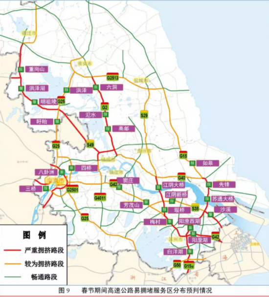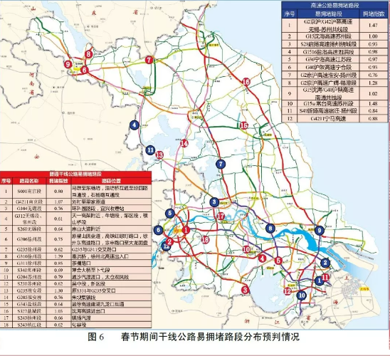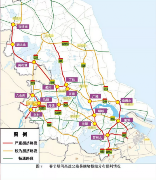 返程期间,易拥堵的30个路段集中在6个高速公路横向路段、6个高速公路纵向路段、11个国道路段和7个省道路段。其中,易拥堵高速公路路段分别为G2京沪/G42沪蓉高速无锡-苏州共线段、G15沈海高速苏州段、S28启扬高速扬州绕城段、G36宁洛高速江苏段、G40沪陕高速宁合段、G2京沪高速广靖锡澄段、G15w常台高速苏州段、S49新扬高速宿迁-扬州段、G4211宁马高速等。