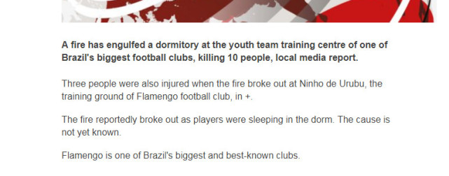 新华社快讯:据外电报道,巴西里约热内卢一足球俱乐部训练中心当地时间8日发生火灾,造成至少10人死亡。
