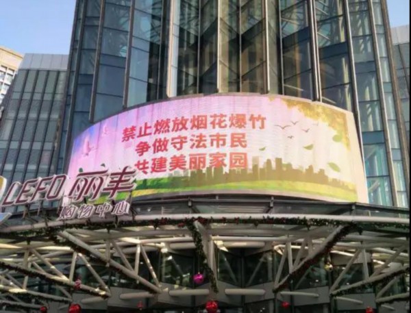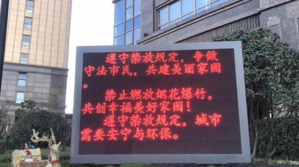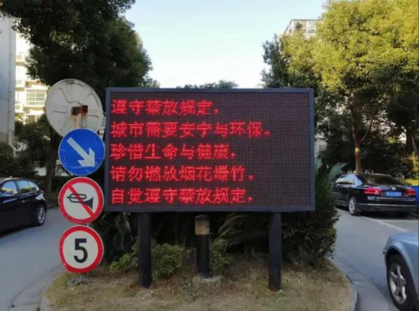 电子屏幕滚动播放宣传内容,提醒市民遵守禁放规定。