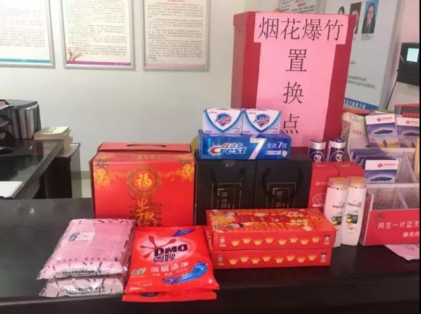 在各社区设置禁放置换点,家里已经买过烟花爆竹又无法退换的居民,可以到置换点换取生活用品。