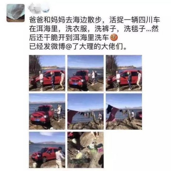据春城晚报报道,经调查,涉事车辆驾驶员张某某于2月7日中午1时许,带着家人开车来到大理市下关洱滨村南边的洱海边游玩,看到洱海水又清又蓝,把车子开进去洗了洗。对于网友拍到的晾晒在一旁的衣物,张某某说是之前泡温泉弄湿了,拿出来晾晒,拒绝承认在洱海里洗衣物。