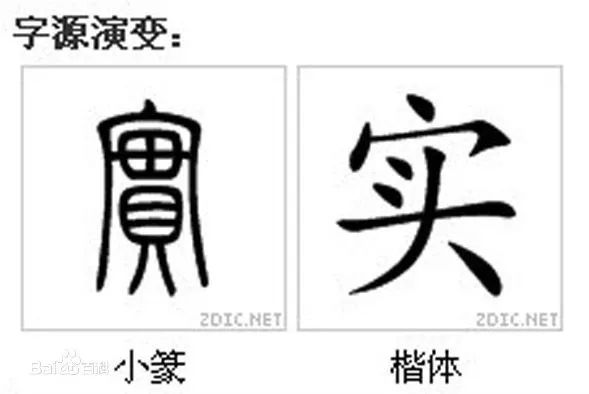 释义:会意字。金文字形,“实”的上面是房子,中间是长满青草的田,下面是表示钱的贝。“实”最初之义是富裕,《说文解字》:“实,富也。从宀,从贯。贯,货贝也。”后引申为充满、充实、实在。