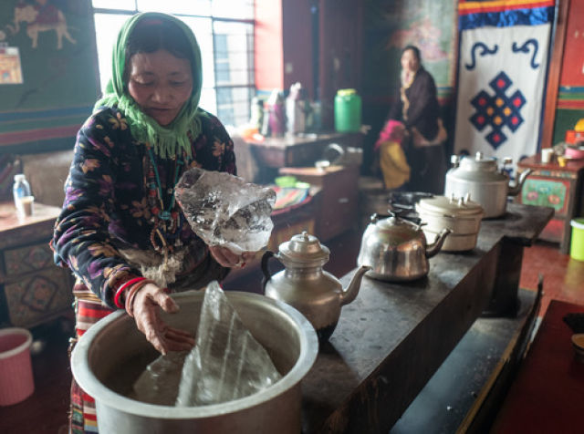 双湖县嘎措乡牧民在化冰烧水(1月31日摄)。新华社记者 普布扎西 摄