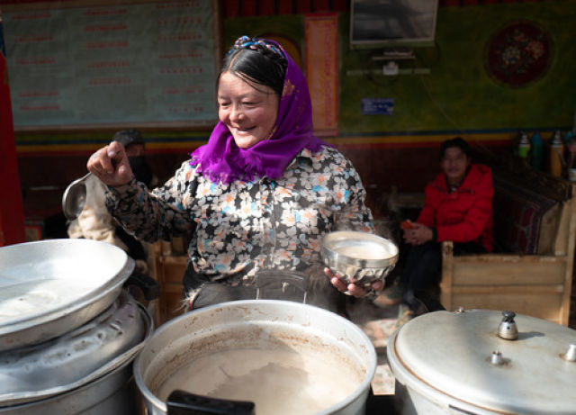 双湖县嘎措乡牧民贡桑曲珍在餐馆里为客人盛饭(1月31日摄)。 新华社记者 普布扎西 摄